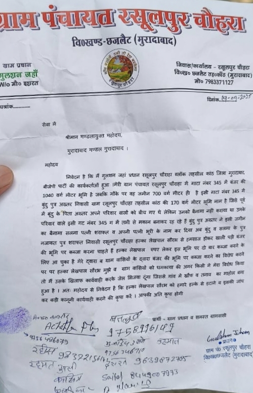 मुरादाबाद/कांठ। तहसील कांठ के ग्राम रसूलपुर चौहरा में ग्राम समाज की करोड़ों रुपये की भूमि पर अवैध कब्जे का मामला गर्मा गया है। ग्रामीणों के अनुसार गाटा संख्या 345 की यह भूमि पिछले 40–50 वर्षों से खाली पड़ी थी, जिसे अब गांव के कुछ दबंग व्यक्तियों द्वारा कब्जाने का प्रयास किया जा रहा है।